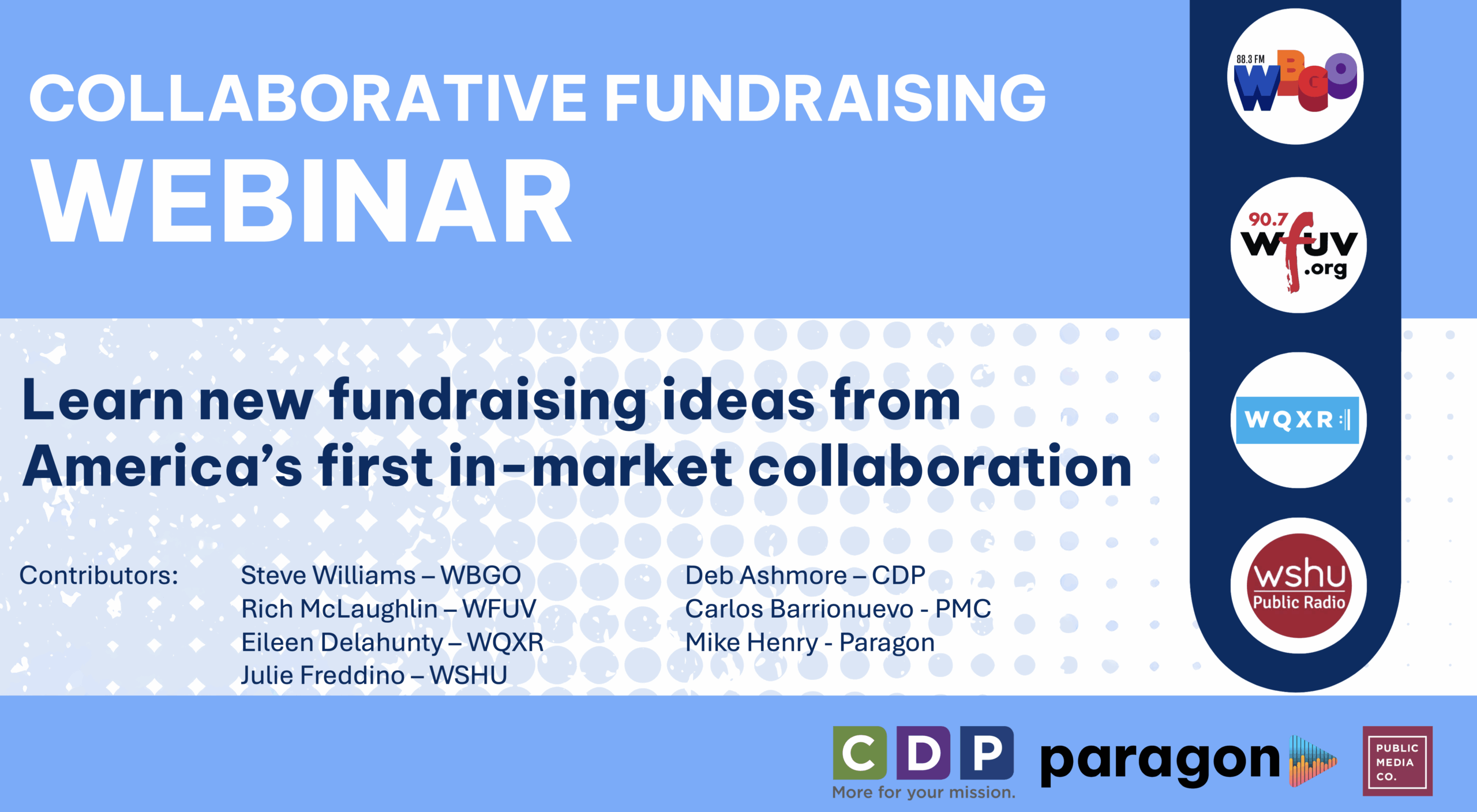 The conversation was centered around Member Donor Overlap and Joint Events & Fundraising, with contributors Steve Williams (WBGO), Rich McLaughlin (WFUV), Eileen Delahunty (WQXR), Julie Freddino (WSHU) , Deb Ashmore (CDP), Carlos Barrionuevo (PMC) and Mike Henry (Paragon).